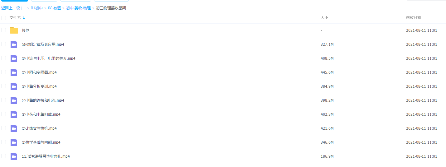 此课件来着有道精品课,有道精品课姜牧物理初中网课 暑期班。此课件的主要知识点包括:欧姆定律及其应用、电流与电压、电阻的关系、电路分析专训、热学基础与内能、比热容与热机、试卷讲解暨毕业典礼等等视频