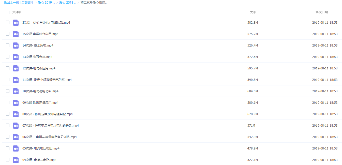 此课件来自质心教育网校,2019初二物理竞赛视频特长班课程汇总,包含视频课程和讲义资料。此课件主要知识点包括:机械能、内能、热值与热机电路认知、电荷与电路、电流电压电阻、探究电流与电压电阻的关系、电阻与能量电路复习训练、欧姆定律、电功和电功率…等等